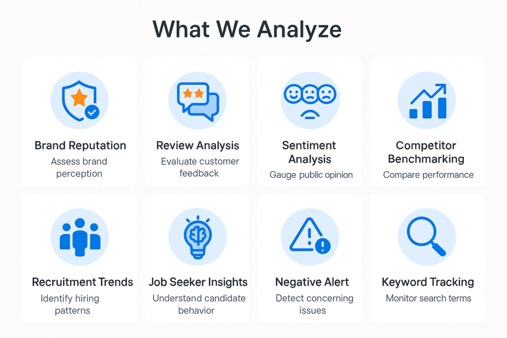 We collect and analyze Thailand market SNS and review data, delivering easy-to-understand visual reports. Sentiment analysis, mention trends, competitor comparison, top keywords, platform distribution, and negative alerts – all insights visualized to support your recruitment and marketing strategy decisions.