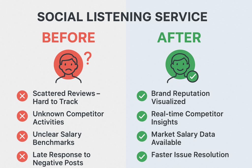 Manual SNS and review management in Thailand leads to scattered information and unknown competitor activities. Social listening tool implementation enables brand reputation visualization, real-time competitor analysis, Thailand salary data access, and instant negative post detection, achieving rapid data-driven decision making.
