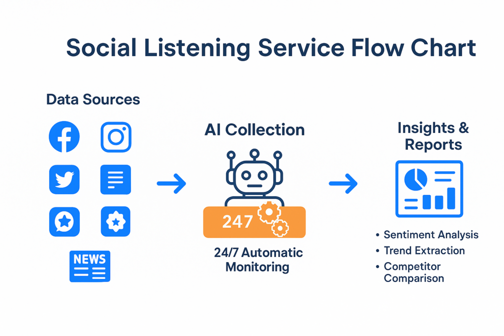 AI automatically collects Thailand market data 24/7 from SNS and review sites including Facebook, Instagram, and TikTok. Through sentiment analysis, competitor comparison, and trend extraction, we visualize insights essential for recruitment and marketing strategies in Thailand, delivering actionable reports.