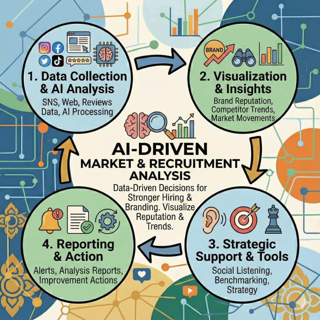 We collect and analyze data from SNS, websites, and review platforms using AI, providing a service that visualizes brand reputation, competitor recruitment trends, and market movements in the Thai market.